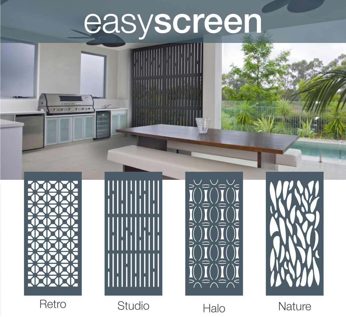 Easyscreen The STANDARD range are ideal for decorative and privacy screening in Commercial and Residential applications. Suitable for use in undercover areas such as patios and pergolas, they provide a unique backdrop to a BBQ area or just to create personal or private spaces around the home or office.